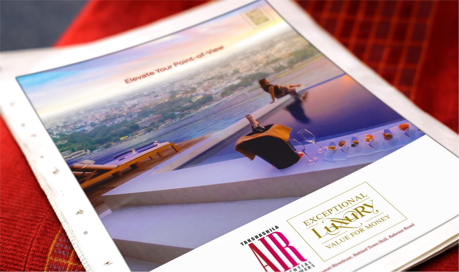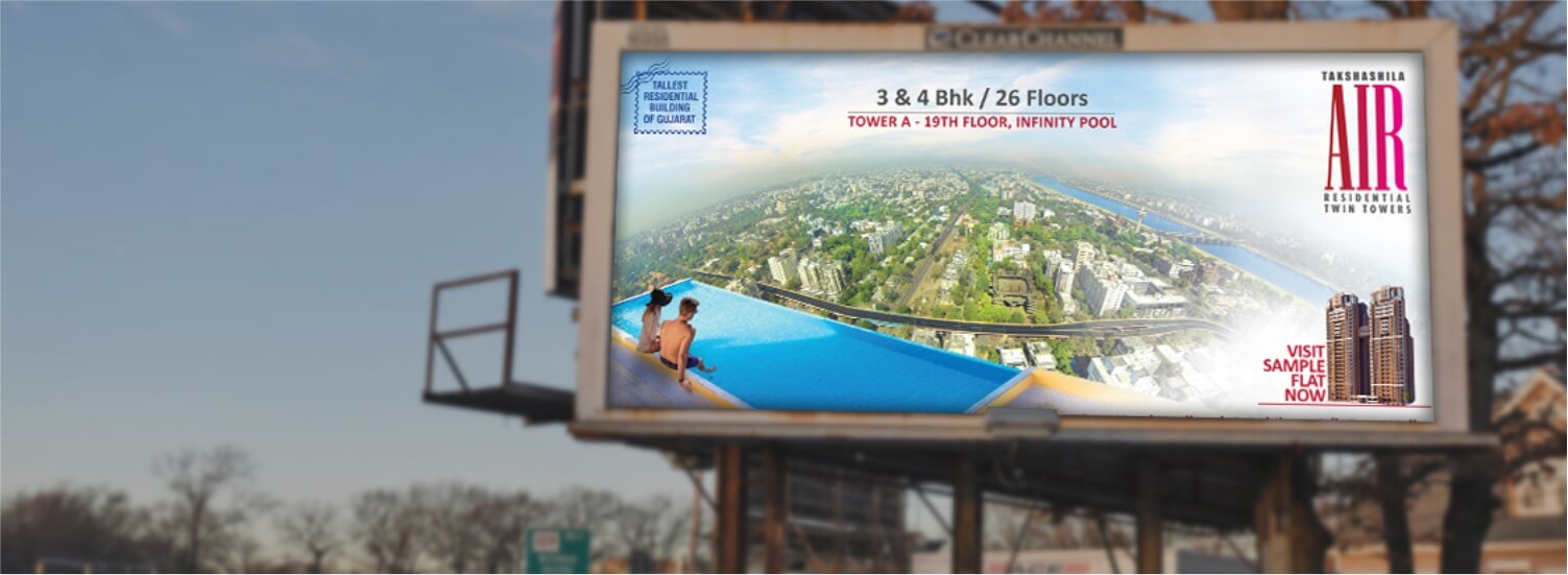 Positioning for ‘Takshashila AIR’ was a no brainer - ‘26 Floors - Gujarat’s Tallest Residential’. The Point of Differentiation for this Tallest Residential was its location. The residential overlooked the world renowned ‘Sabarmati Riverfront’ and beyond. The USP became the visual representation to generate curiosity among the defined audience.