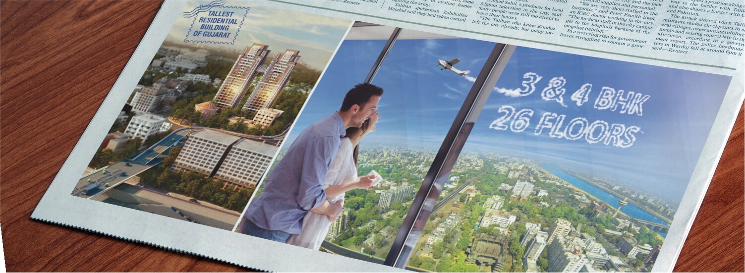 The primary audience were young couples living in the older part of Ahmedabad city who were planning to shift to the modern city. The communication had to invite this audience to consider ‘AIR’ as the location was the starting point from where the modern city began. The secondary audience were the NRIs looking to buy & live during their visit to the city. The amenities on higher floors was the attracting point for this audience.